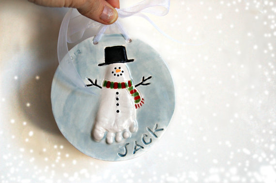 What a unique and cute keepsake of baby's foot print captured in ceramic clay with name and date etched and printed on front. You can also request a snowgirl with pink snow cap in third photo. www.thebabyhandprintco.etsy.com